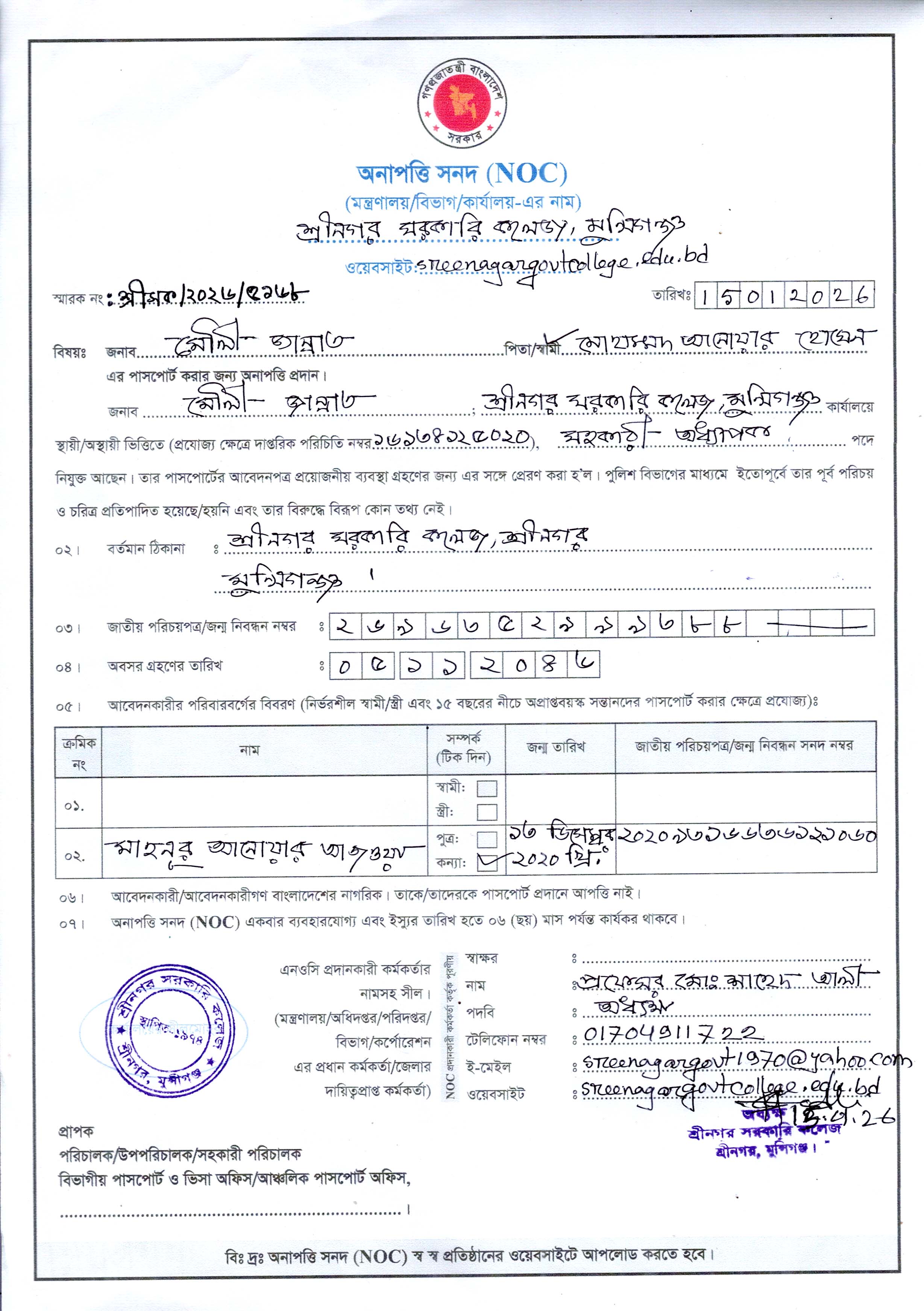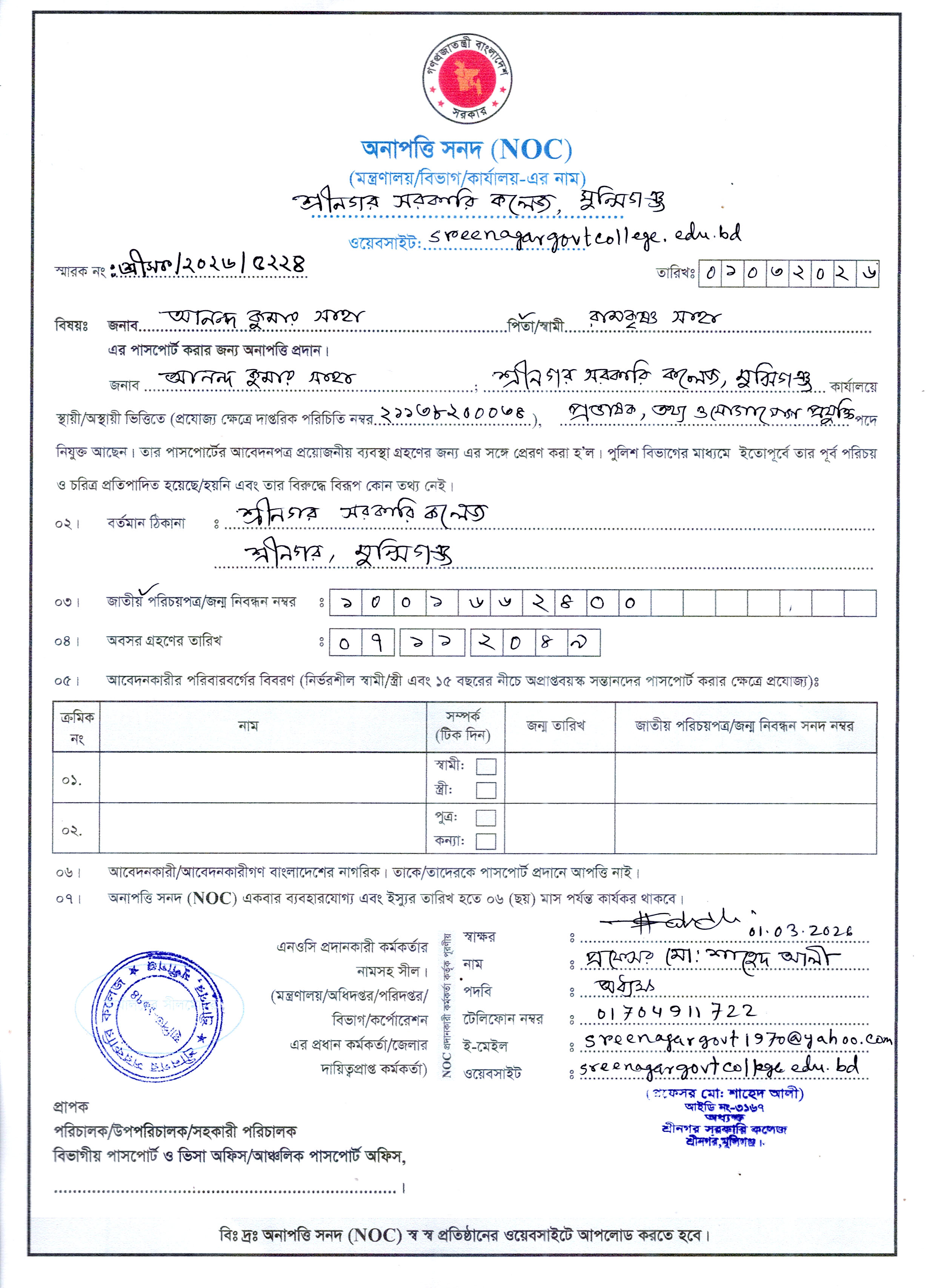 জনাব মোহাম্মদ নাসির হোসেন, সহযোগী অধ্যাপক, রাষ্ট্রবিজ্ঞান এর আন্তর্জাতিক পাসপোর্ট নবায়নের জন্য NOC প্রদান। |